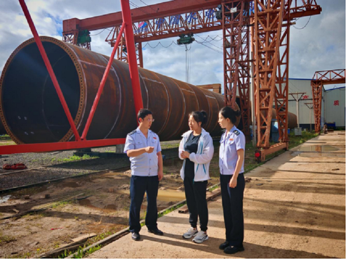 图为国家税务总局康保县税务局“绿税通”团队深入河北鑫赛新能源科技有限公司,了解企业生产经营情况,讲解税费优惠政策,助力新能源装备制造企业创新发展。